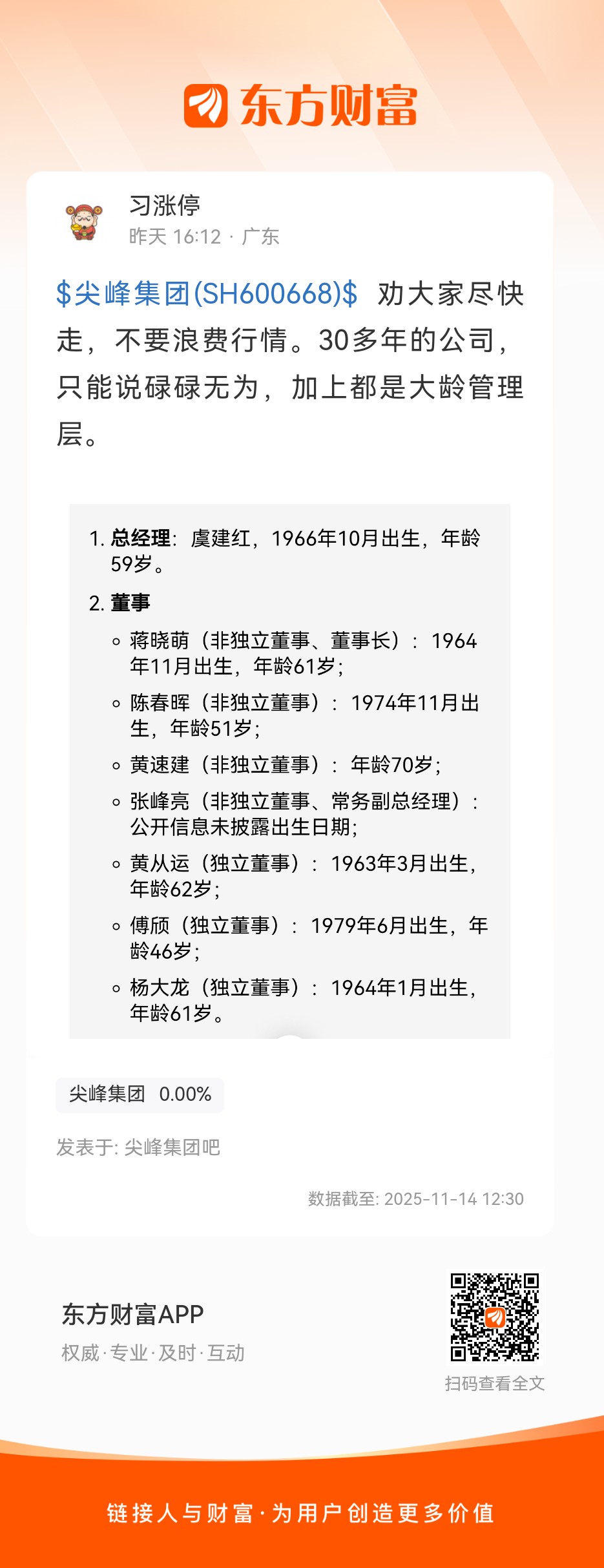 $尖峰集团(SH600668)$  劝大家尽快走,不要浪费行情。30多年的公司,只能说碌碌无为,加上都是大龄管理层。