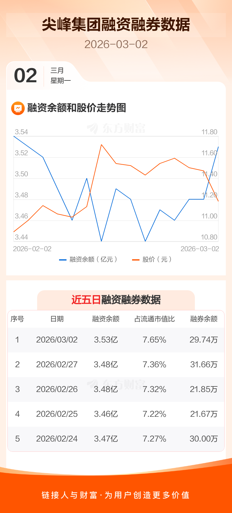 交易所最新数据显示,尖峰集团于2026年3月2日获融资买入1174.93万元,融资偿还709.54万元,当日融资净买入465.39万元。目前,该股融资余额3.53亿,占流通市值比例为7.65%。