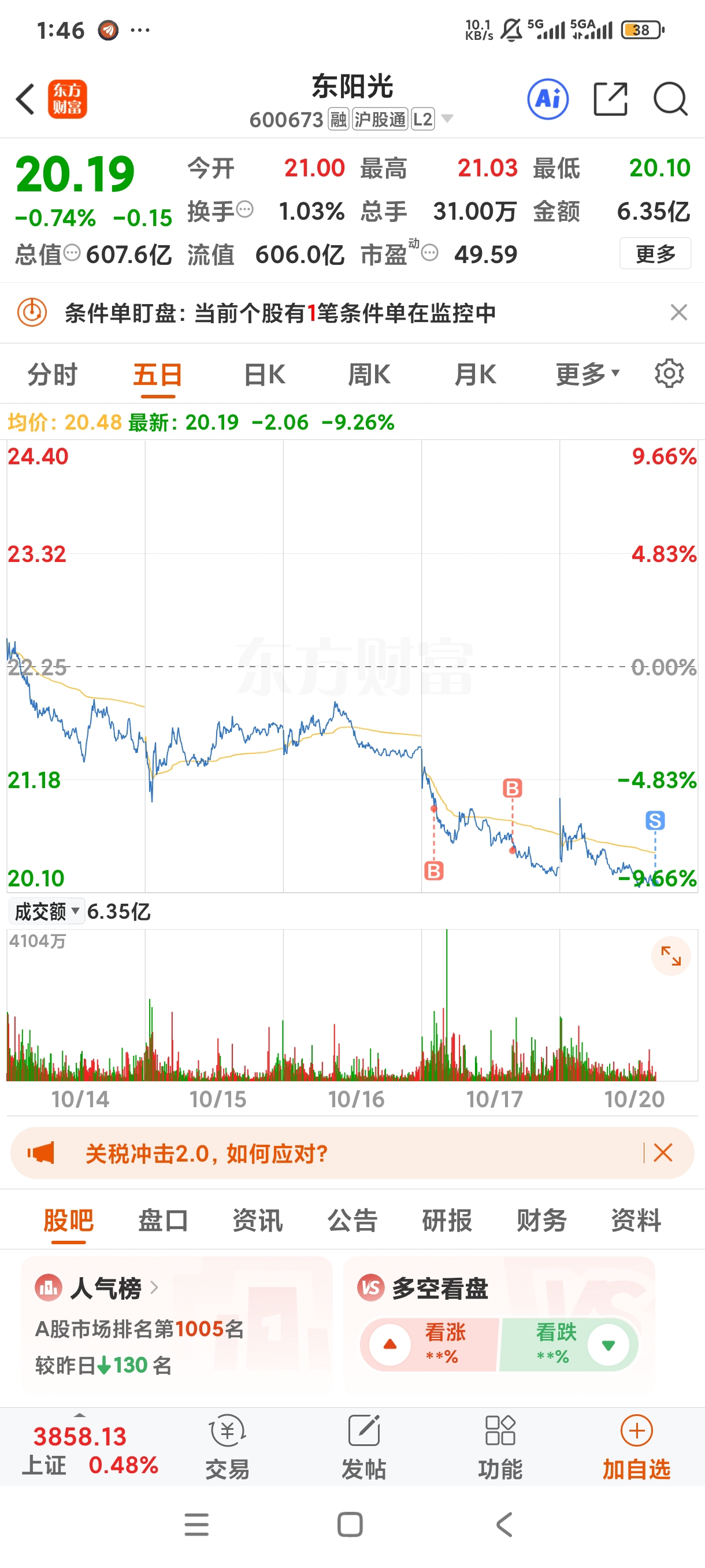 $东阳光(SH600673)$ 该强不强视为弱,哎割了,万一大盘跌下来,这货估计得一泻千里。。。。。