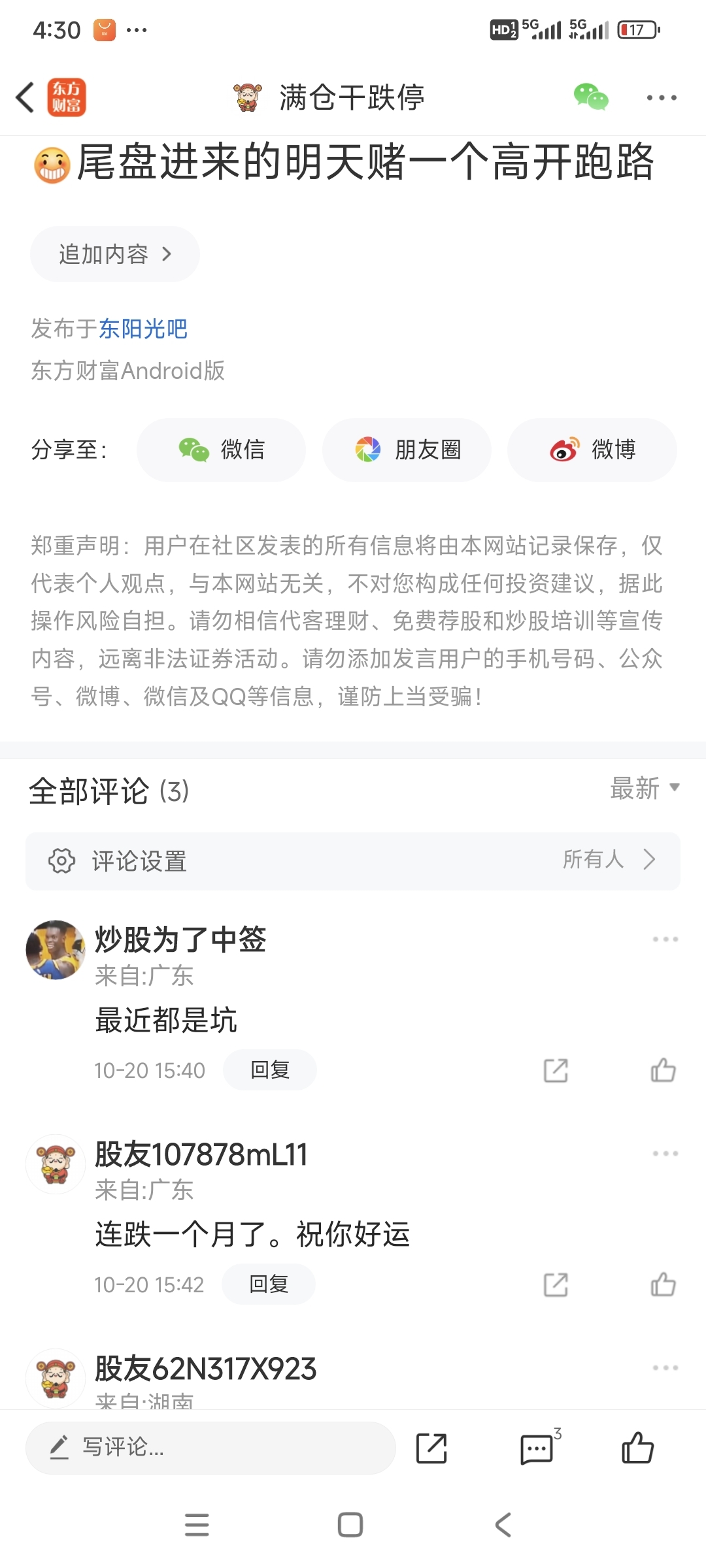 温馨提示: 1.根据《证券法》规定,禁止编造、传播虚假信息或者误导性信息,扰乱证券市场;2.用户在本社区发表的所有资料、言论等仅代表个人观点,与本网站立场无关,不对您构成任何投资建议。用户应基于自己的独立判断,自行决定证券投资并承担相应风险。《东方财富社区管理规定》
