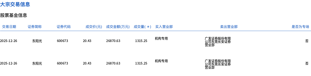 东阳光今日大宗交易折价成交2630.5万股,成交额5.37亿元