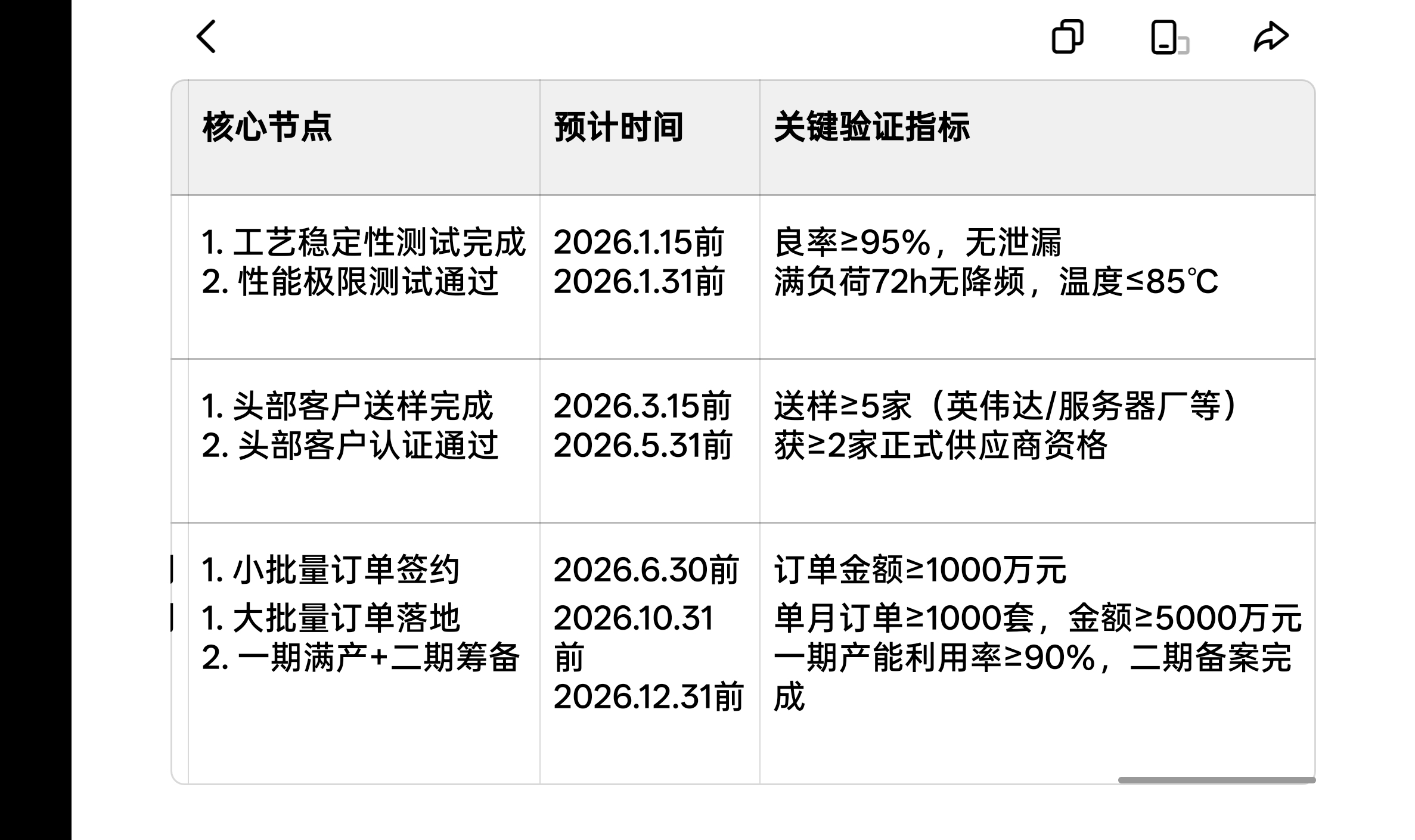 核心逻辑:聚焦可验证里程碑+关键指标,无冗余信息,方便快速对照公告/互动易判断进度