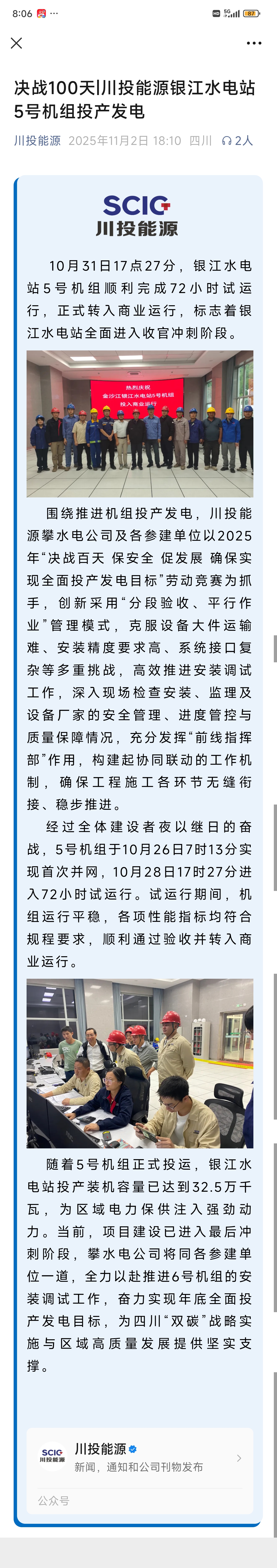 决战100天|川投能源银江水电站5号机组投产发电 川投能源