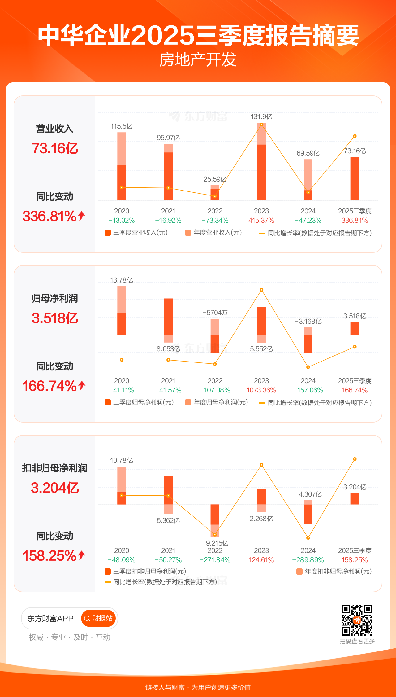 中华企业10月31日发布2025年三季报显示,公司前三季实现营业收入73.16亿元,同比增长336.81%;归母净利润3.52亿元,同比增长166.74%;扣非归母净利润3.20亿元,同比增长158.25%。