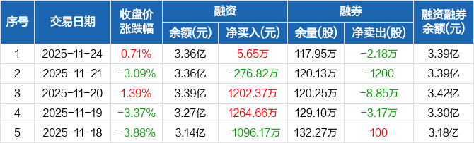融资方面,当日融资买入1968.55万元,融资偿还1962.9万元,融资净买入5.65万元。融券方面,融券卖出6.04万股,融券偿还8.22万股,融券余量117.95万股,融券余额334.98万元。融资融券余额合计3.39亿元。