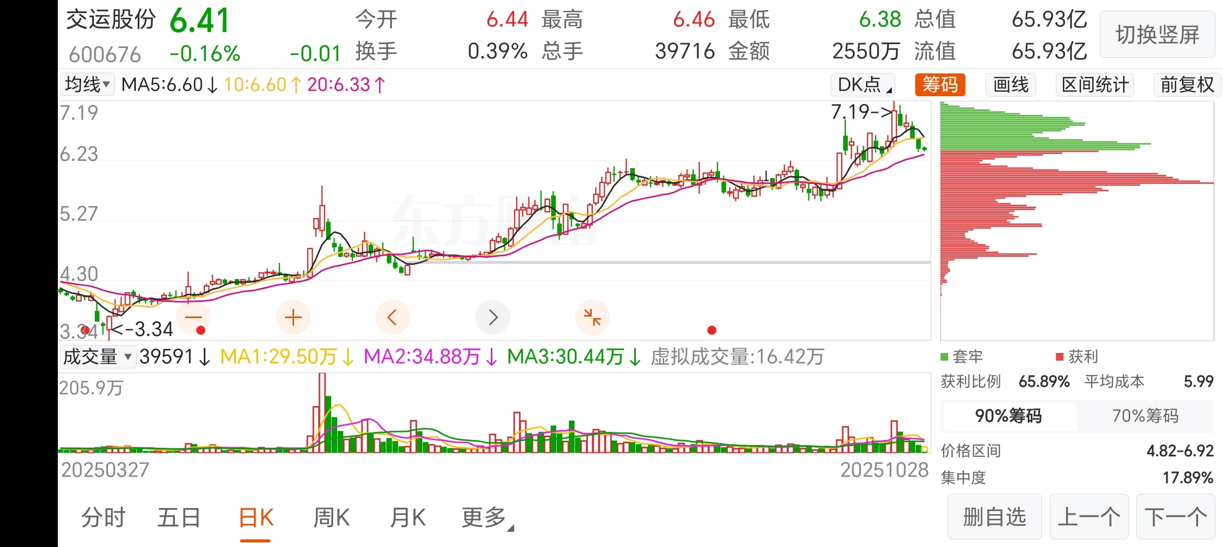 $交运股份(SH600676)$ #炒股日记# #强势机会# 牛市不换股,这几天一直是高量比低换手,底部筹码峰还没动,不知道有些人慌个毛线?
