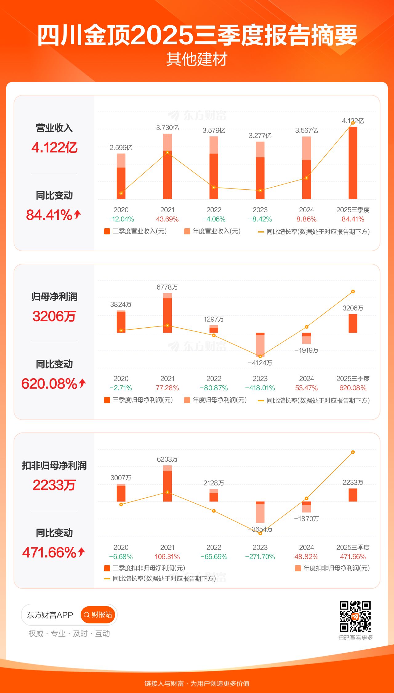 四川金顶10月31日发布2025年三季报显示,公司前三季实现营业收入4.12亿元,同比增长84.41%;归母净利润3205.85万元,同比增长620.08%;扣非归母净利润2233.41万元,同比增长471.66%。