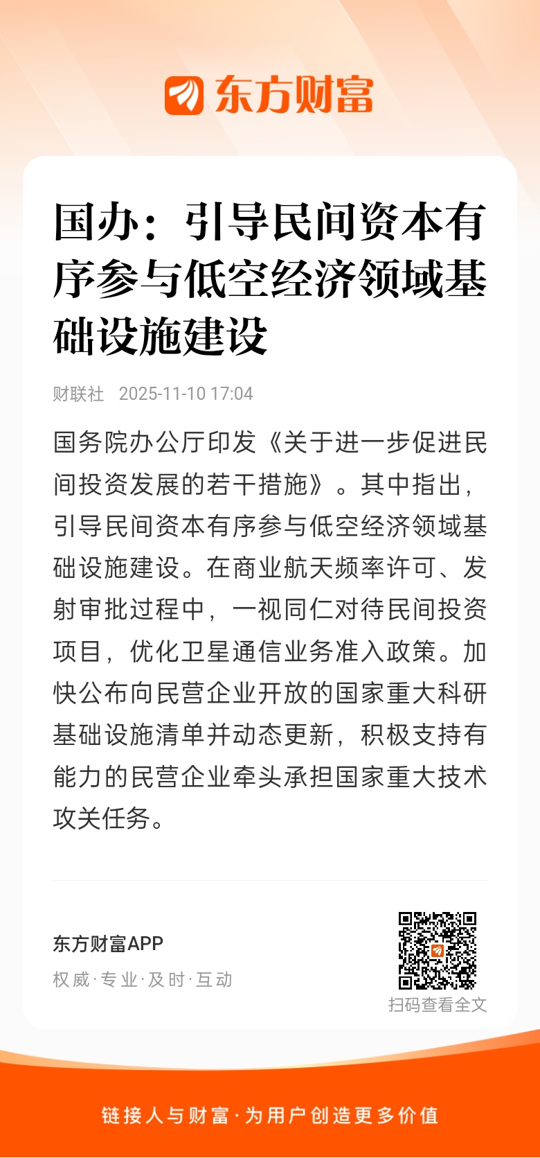 国务院办公厅印发《关于进一步促进民间投资发展的若干措施》。其中指出,引导民间资本有序参与低空经济领域基础设施建设。在商业航天频率许可、发射审批过程中,一视同仁对待民间投资项目,优化卫星通信业务准入政策。加快公布向民营企业开放的国家重大科研基础设施清单并动态更新,积极支持有能力的民营企业牵头承担国家重大技术攻关任务。