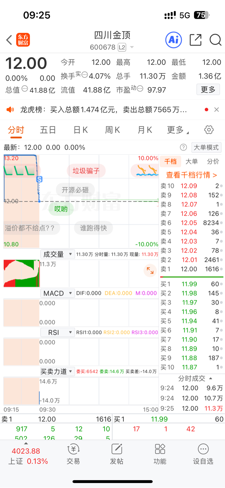 $四川金顶(SH600678)$ 无语了,三板组的玩意,本来想出半仓,结果太差了全走了,也不想等上影线了