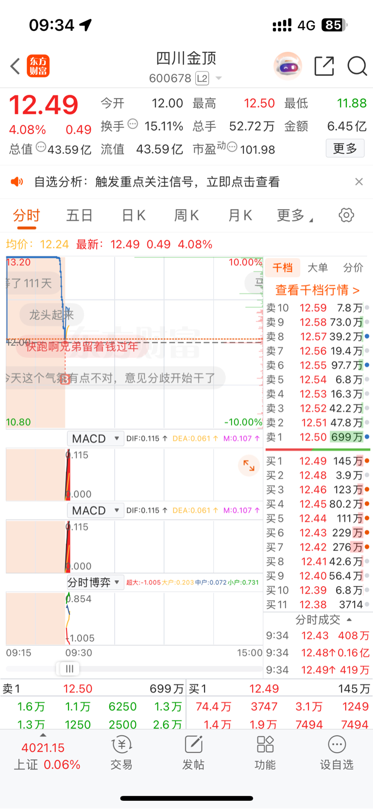 $四川金顶(SH600678)$ 日内最低点买入博弈
