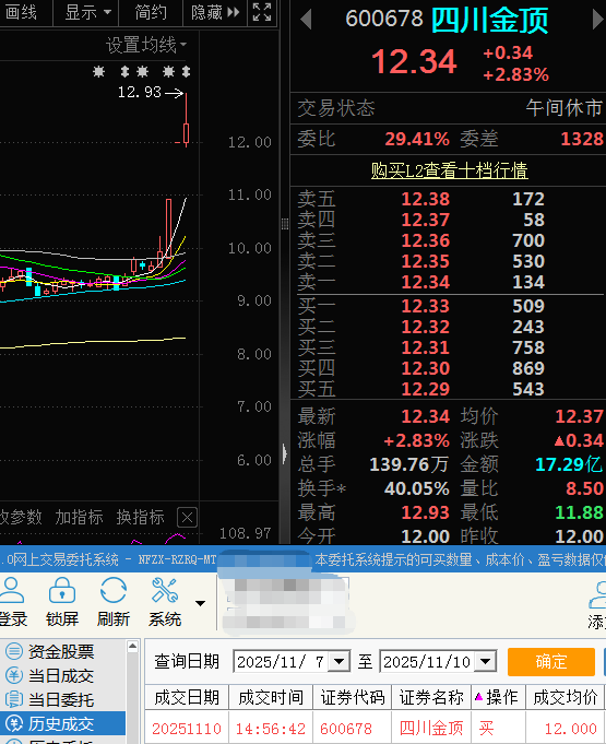 600678四川金顶昨天尾盘买入今天平开,早盘拉升8个点附近持股没动,午后封板继