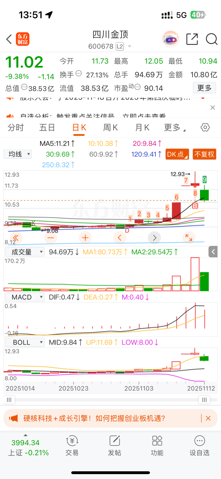 $四川金顶(SH600678)$ 昨天默默地自己吃面。没坑大家。我自己承受这碗面吧。