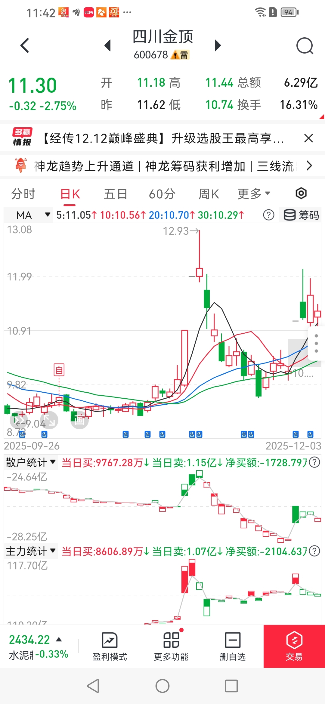 $四川金顶(SH600678)$ 经传多赢手机版数据短线王123元年费,跟明庄量化昨天减仓了,那大单看到控盘量化减仓了,受惊早上在抛货减仓。不会看盘,那量化在对接散户小单啊?它昨天出货,说明被对接散户大概15个左右散户吃货了啊。今天完美做T成功,被对接小单我仓位3分之二。