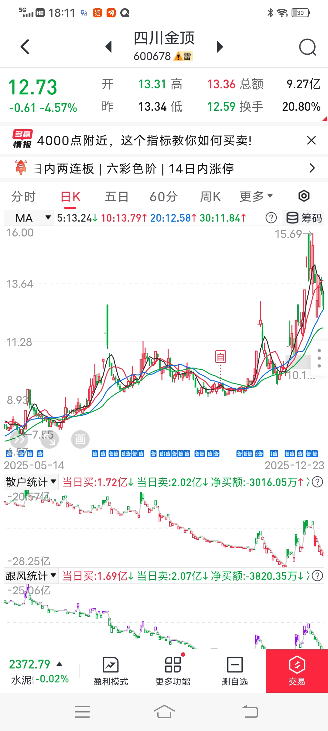 $四川金顶(SH600678)$ 资金不大,要拉升阴线,盈利盘被对接散户可能要走了啊?行情预测,短期震荡。大单去别的地方了。
