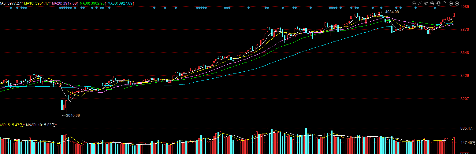 今日三大股指延续强势,集体放量上扬,成交量大幅放大至5000亿,市场情绪爆棚。节后归来大盘表现出色,上涨个股数量达到4000家上下,普涨格局打开。沪指走出十二连阳的彪悍行情,距离4034点的前期高点仅一步之遥。当下市场做多力量集结,趋势明朗,期待周二突破前高,走出一波加速上行行情。