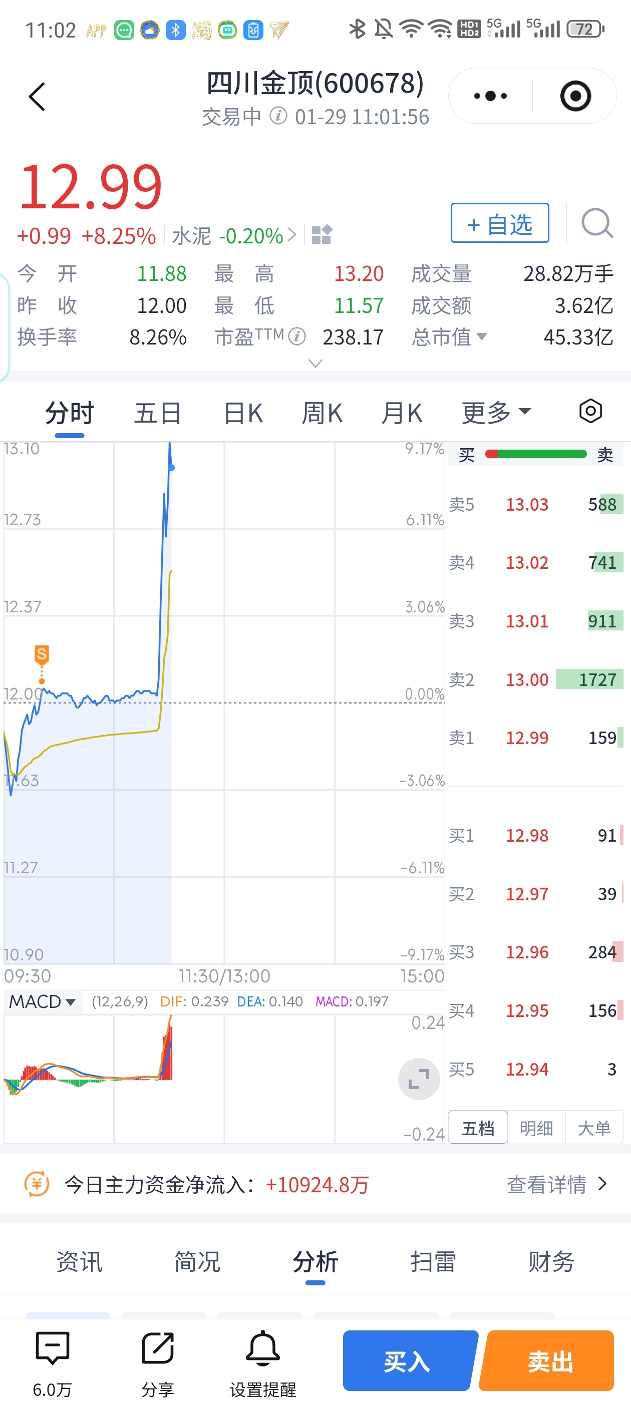 $四川金顶(SH600678)$ 今天我的一个股跌停,然后把金顶隔了补它去了,结果跌停的按到地板上死死的,这金顶又错过了回本机会