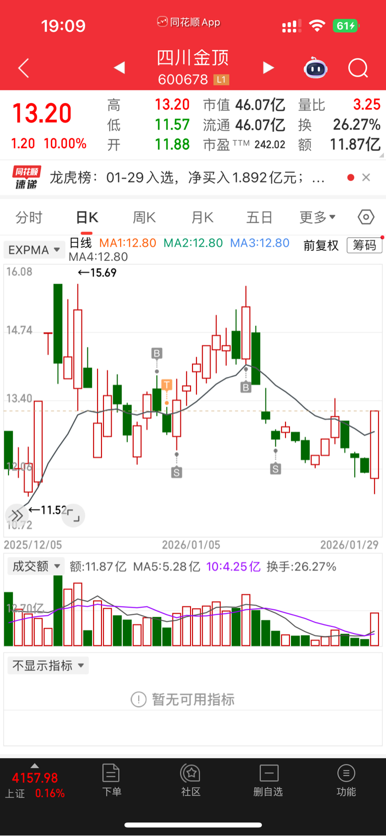 $四川金顶(SH600678)$ 兄弟们 下次我早点卖 你们早点吃肉