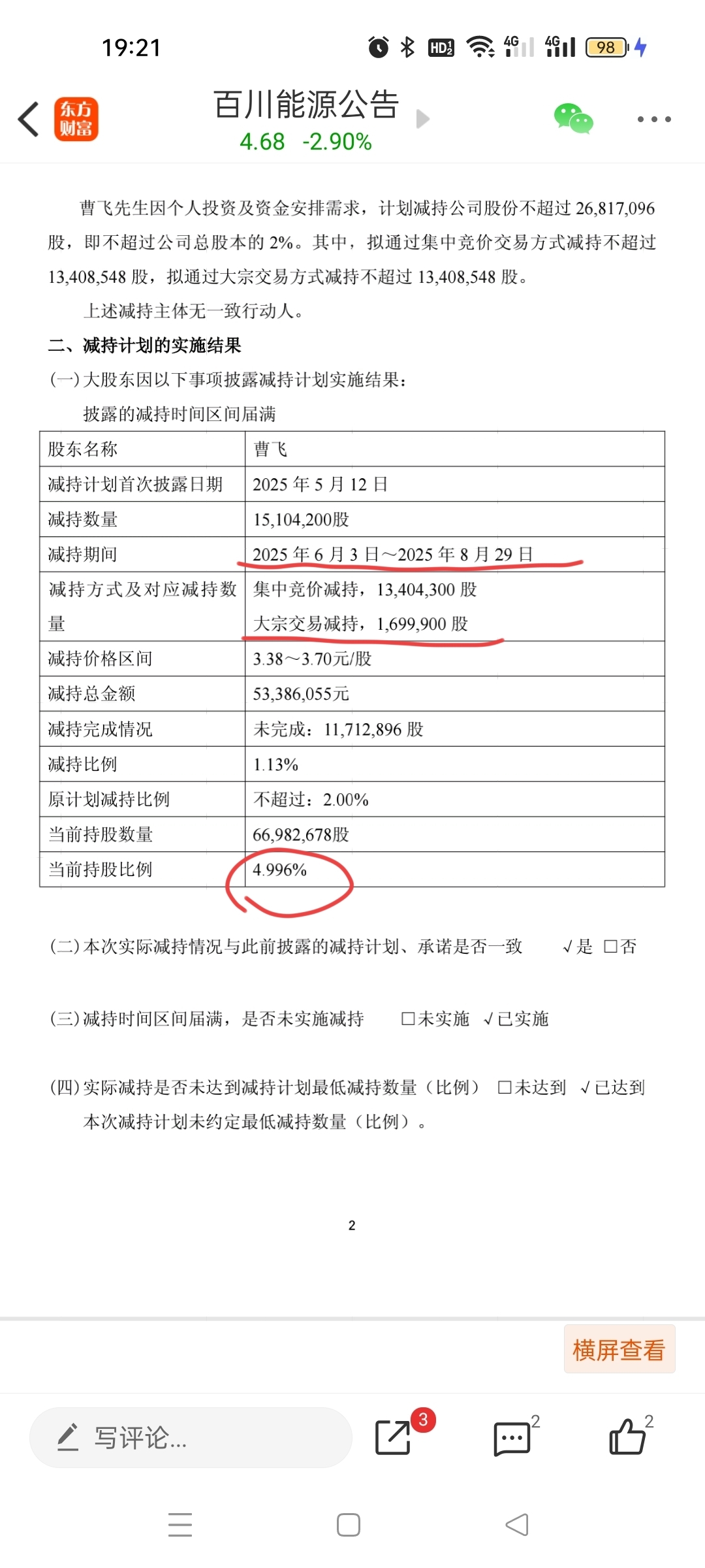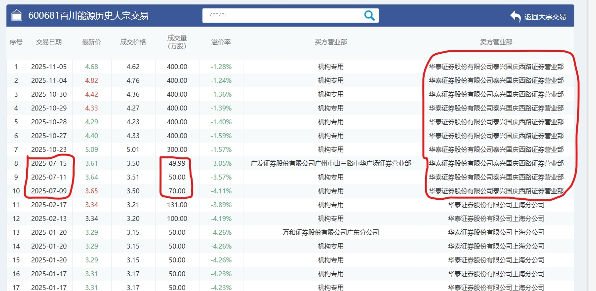 $百川能源(SH600681)$ 持股股东曹飞从2022年开始每年,每个季度都在不同程度的减持(集中竞价和大宗交易),最近连续7次大宗交易确实是他,上次公告减持进度之后持股比例4.996%,小于5%,不必公告。根本不用大惊小怪,都是机构吃了,把握住机会吧。