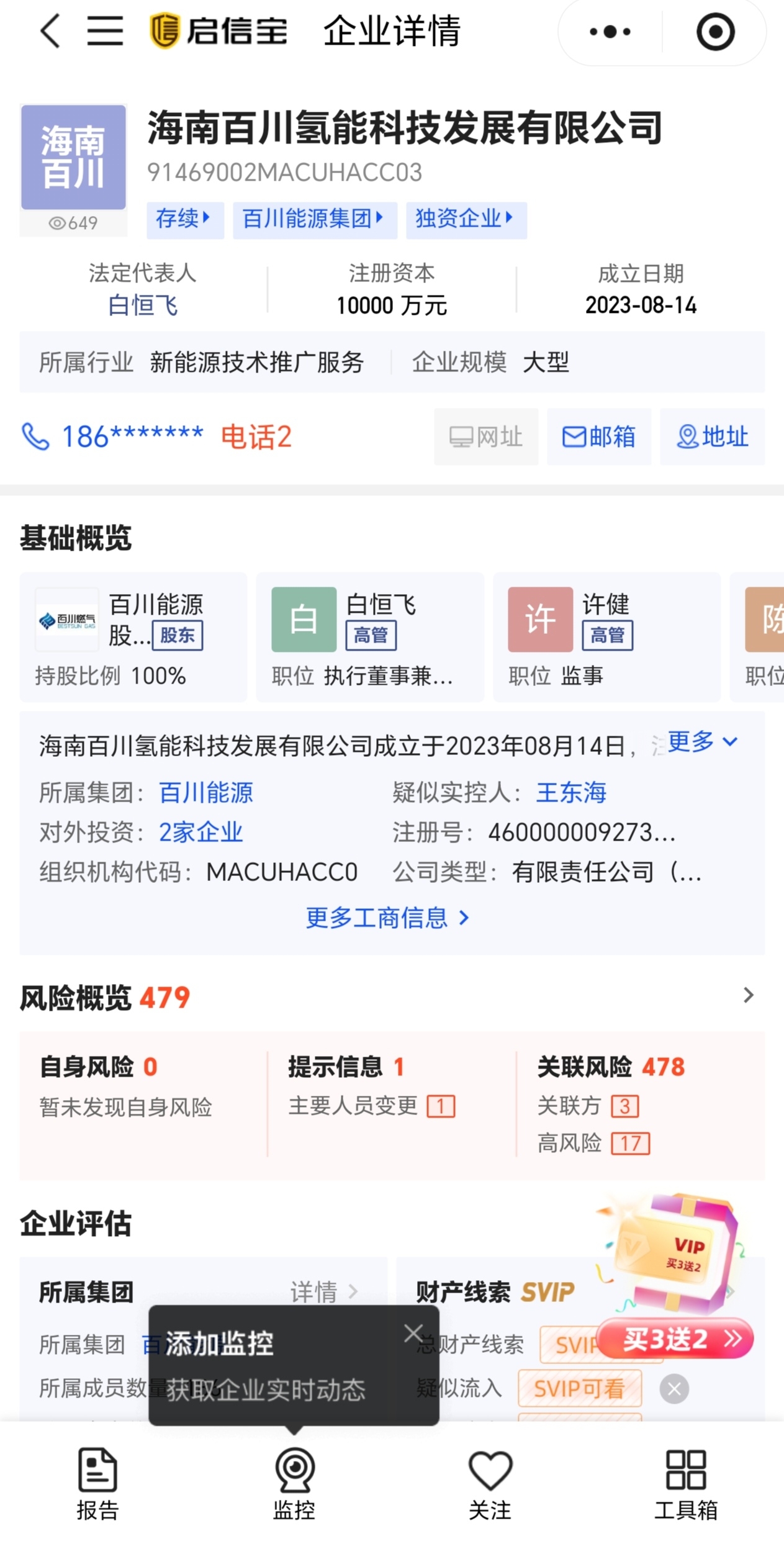 海南百川氢能科技发展有限公司成立于2023年8月14日,是百川能源股份有限公司旗下的全资子公司。其法定代表人为白恒飞 。