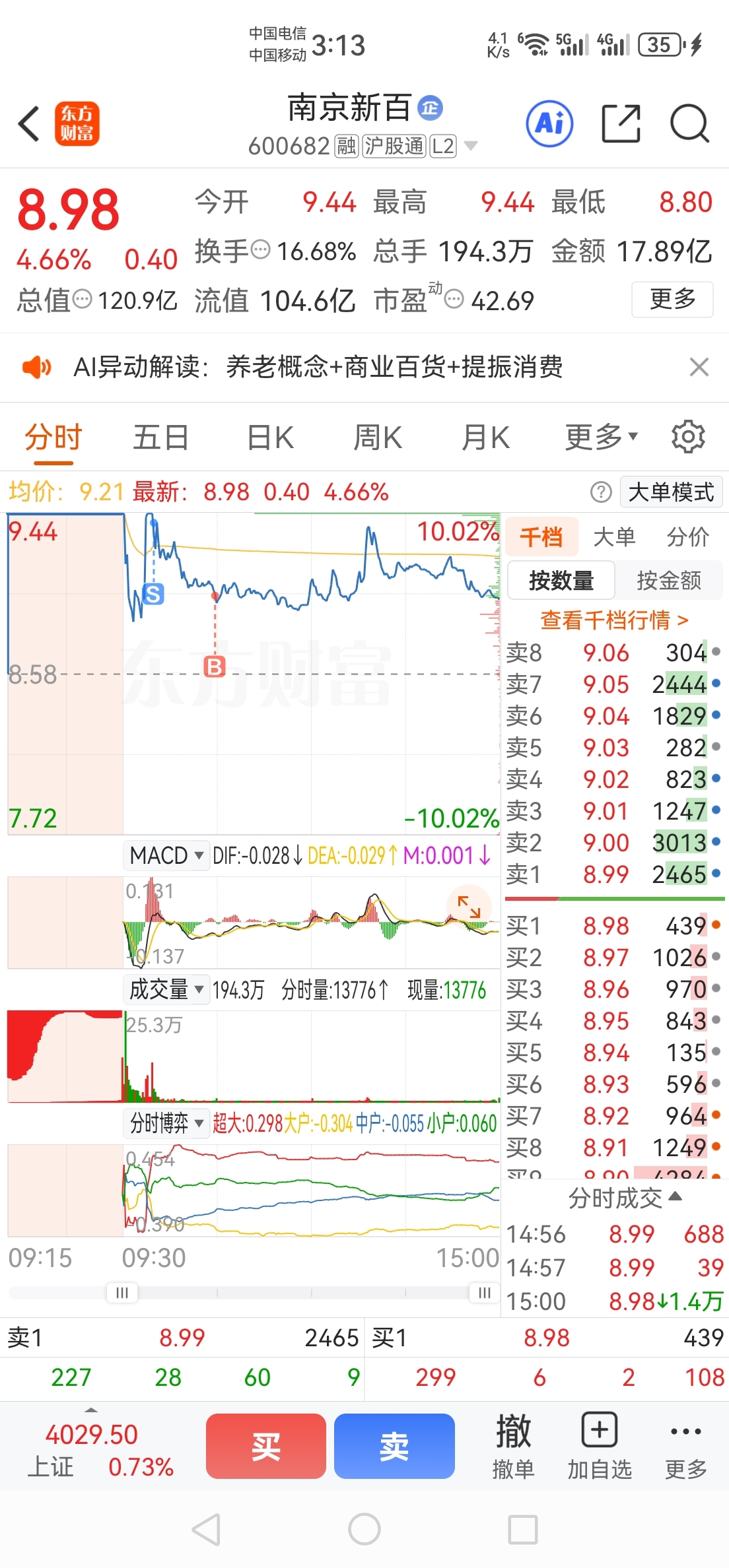 $南京新百(SH600682)$ 还好跑得快,看破板了,就卖了,9元又接回来了,希望明天给机会出
