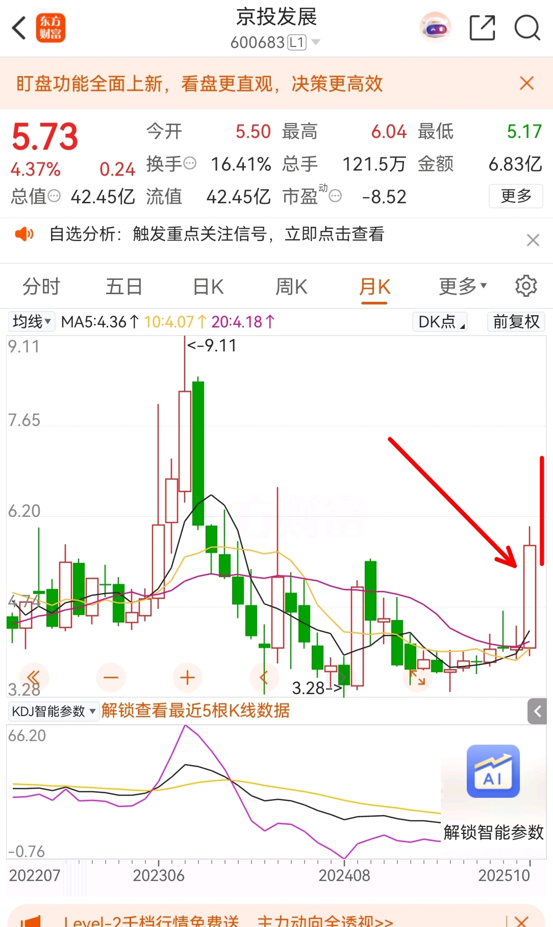 $京投发展(SH600683)$ 京投好就好在月底启动,首个月线涨幅40多点,而且无长上影线,周一新月线启动,最差也会出个长上影线超过6.04的