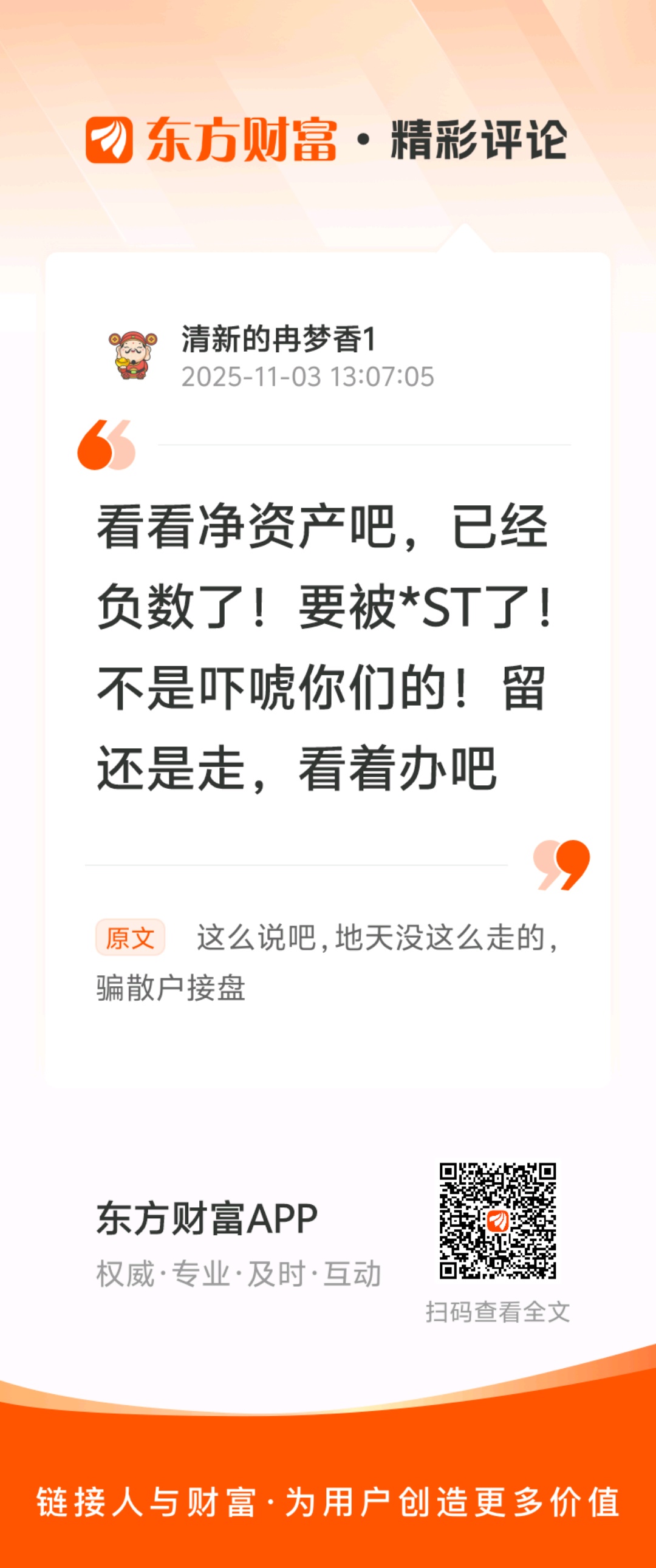 //@清新的冉梦香1 :看看净资产吧,已经负数了!要被*ST了!不是吓唬你们的!留还是走,看着办吧