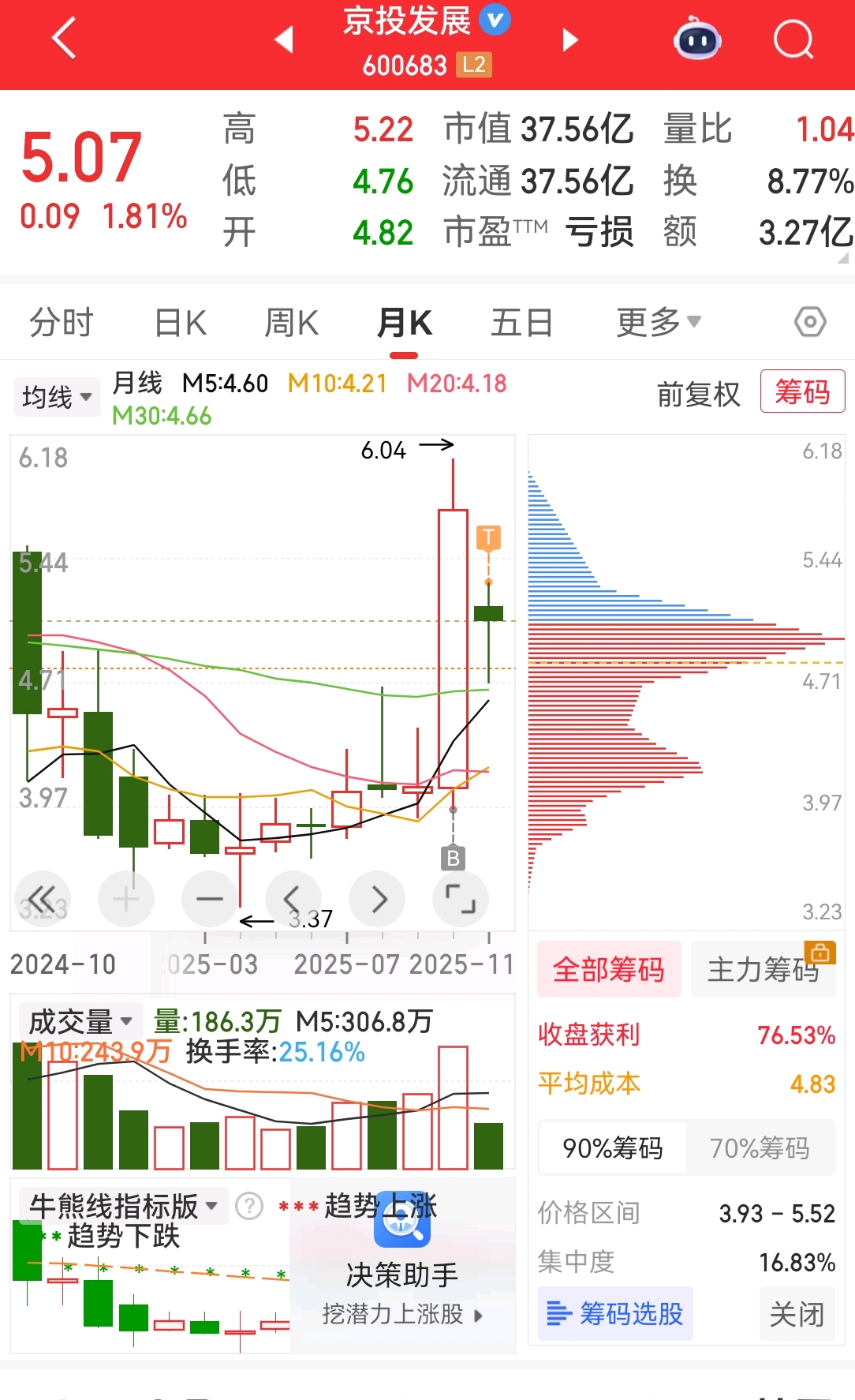 $京投发展(SH600683)$ 为什么十一月加仓了京投,第一波我下半年主打地产,第二,月线没见过走成这样的,10月首次涨40个点,11月线连摸一下6.04动作都没有?我不信