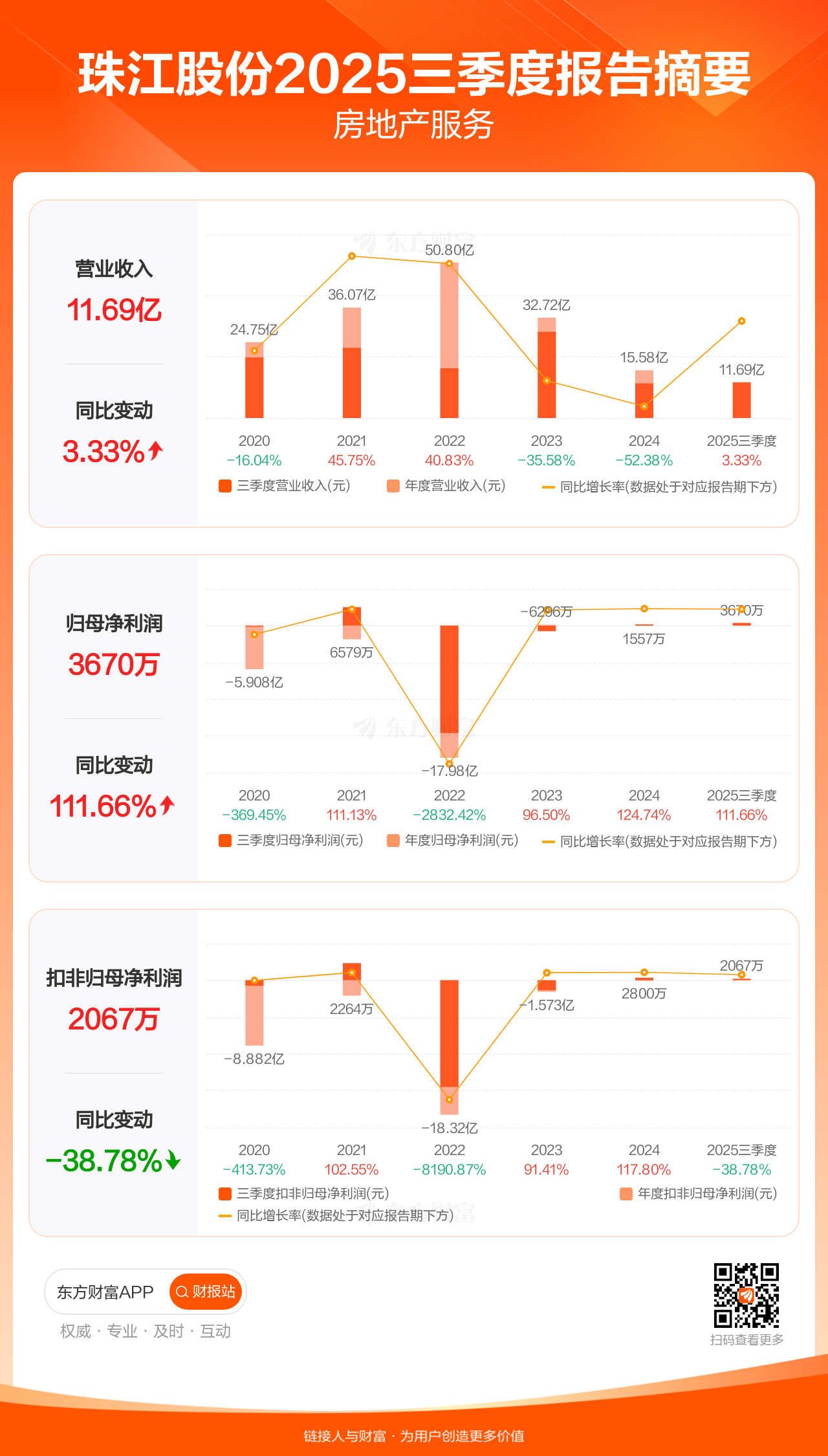 珠江股份10月31日发布2025年三季报显示,公司前三季实现营业收入11.69亿元,同比增长3.33%;归母净利润3669.50万元,同比增长111.66%;扣非归母净利润2067.00万元,同比下滑38.78%。