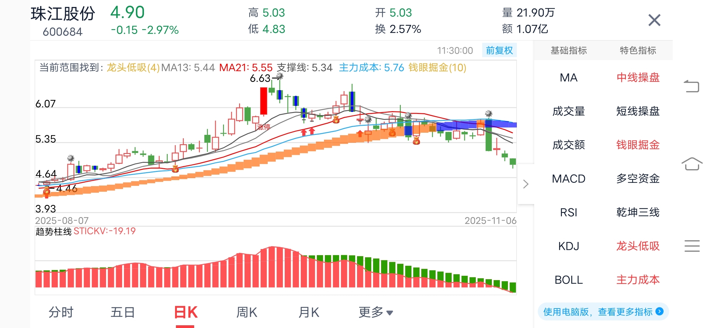 $珠江股份(SH600684)$ 中线操盘和趋势柱线,显示刚开始,,,不知什么时候是底,连个反弹都没