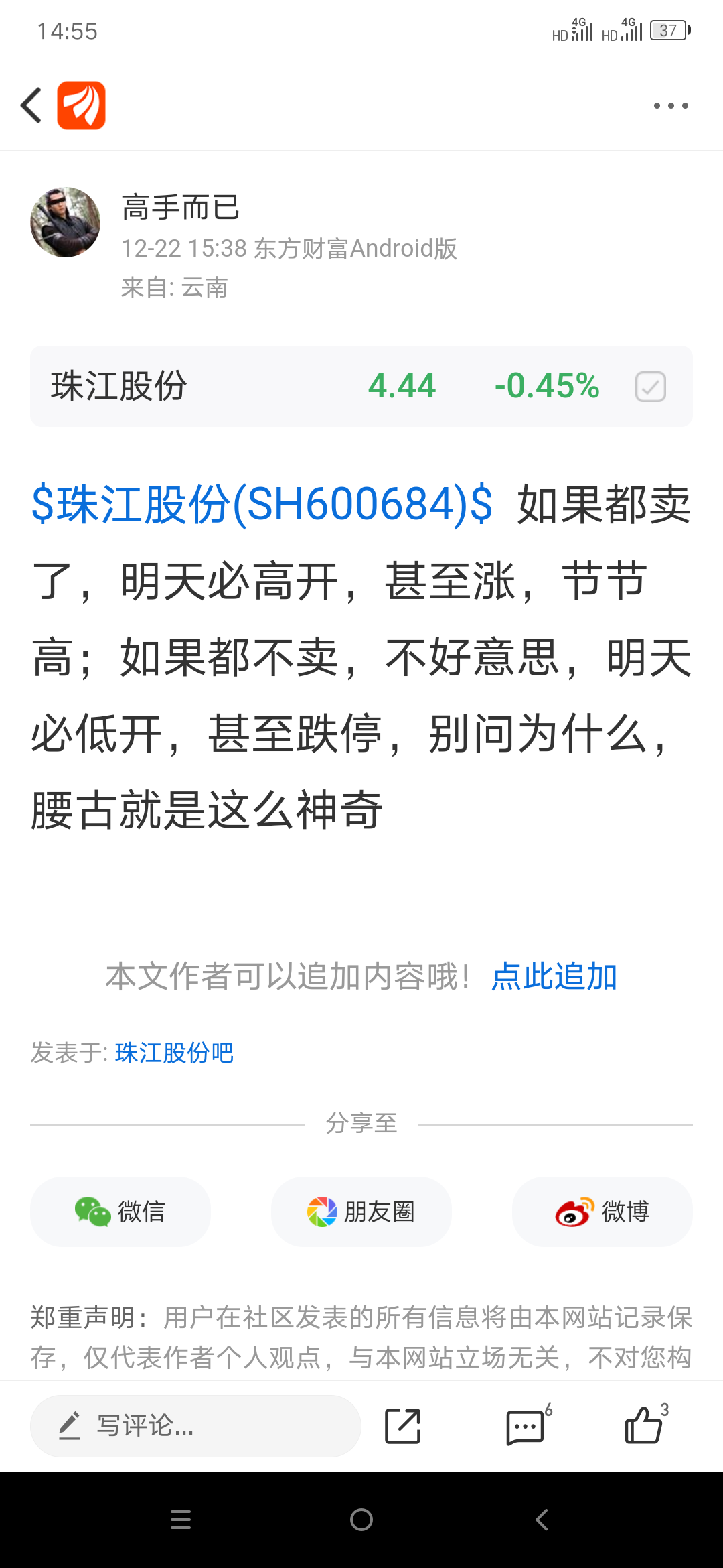 温馨提示: 1.根据《证券法》规定,禁止编造、传播虚假信息或者误导性信息,扰乱证券市场;2.用户在本社区发表的所有资料、言论等仅代表个人观点,与本网站立场无关,不对您构成任何投资建议。用户应基于自己的独立判断,自行决定证券投资并承担相应风险。《东方财富社区管理规定》
