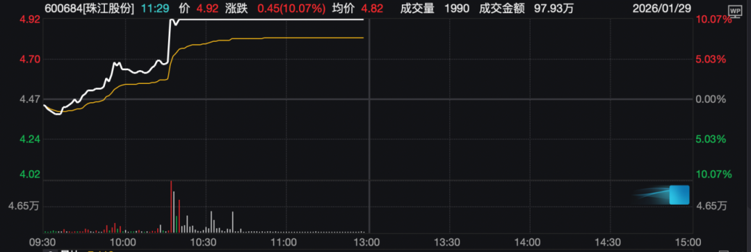 1月29日,A股体育产业个股盘中拉升。其中,珠江股份(600684)在2分钟内直线拉升涨停。