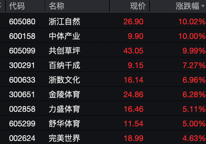 除了珠江股份外,浙江自然、中体产业、共创草坪等涨停,百纳千成涨超7%,浙数文化、金陵体育涨超6%,力盛体育涨5.11%,舒华体育涨5%。