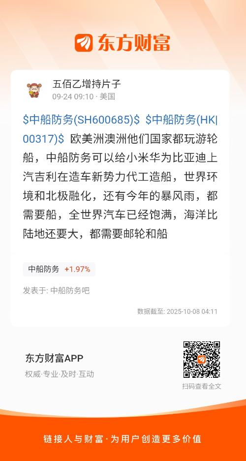 $中船防务(SH600685)$ $中船防务(HK|00317)$ 欧美洲澳洲他们国家都玩游轮船,中船防务可以给小米华为比亚迪上汽吉利在造车新势力代工造船,世界环境和北极融化,还有今年的暴风雨,都需要船,全世界汽车已经饱满,海洋比陆地还要大,都需要邮轮和船