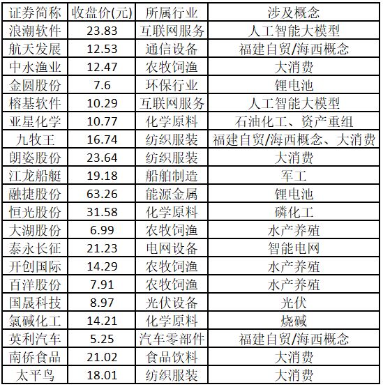 涨停板个股中,股价创出近一年新高的个股有20只(不包括创出历史新高的个股),包括浪潮软件、航天发展、中水渔业、金圆股份、榕基软件、亚星化学、九牧王、朗姿股份、江龙船艇、融捷股份、恒光股份、大湖股份、泰永长征、开创国际、百洋股份、国晟科技、氯碱化工、英利汽车、南侨食品、太平鸟,具体如下表所示。