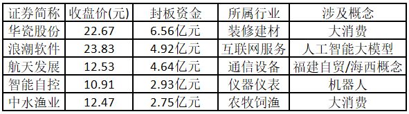 从封板资金来看,今日涨停板个股中,封板资金排名前5的个股包括华瓷股份、浪潮软件、航天发展、智能自控、中水渔业。