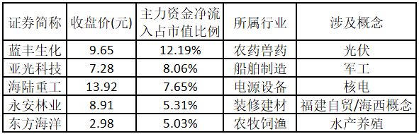 主力资金净流入金额占市值比例排名前5的个股分别为蓝丰生化、亚光科技、海陆重工、永安林业、东方海洋。