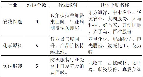 从行业特征来看,今日涨停板个股中,农牧饲渔、化学原料、纺织服装行业的个股最多。