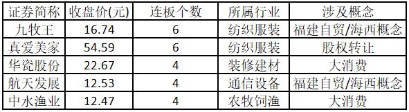 从连板情况来看,今日首板个股有39只;2连板的个股有7只;3连板及以上的个股有8只。今日连板数排名前5的个股包括九牧王、真爱美家、华瓷股份、航天发展、中水渔业,具体如下表所示。