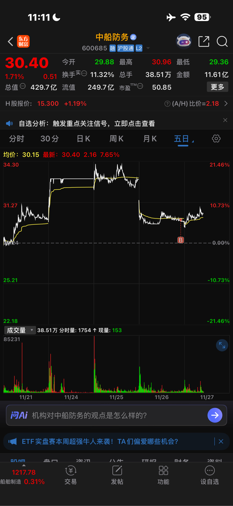 $中船防务(SH600685)$ 前天有老铁推荐的。昨天100个接了,持有一个半月,无论涨跌都走。哈哈哈哈哈