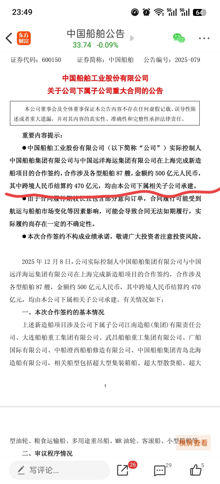 都是中国船舶的单子,希望明天防务也跟着板块高开高走吧