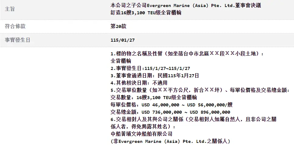 其中,在中船黄埔文冲船舶有限公司订造16艘3100TEU型集装箱船,单船价格4600万~5600万美元,总交易金额7.36亿~8.96亿美元。