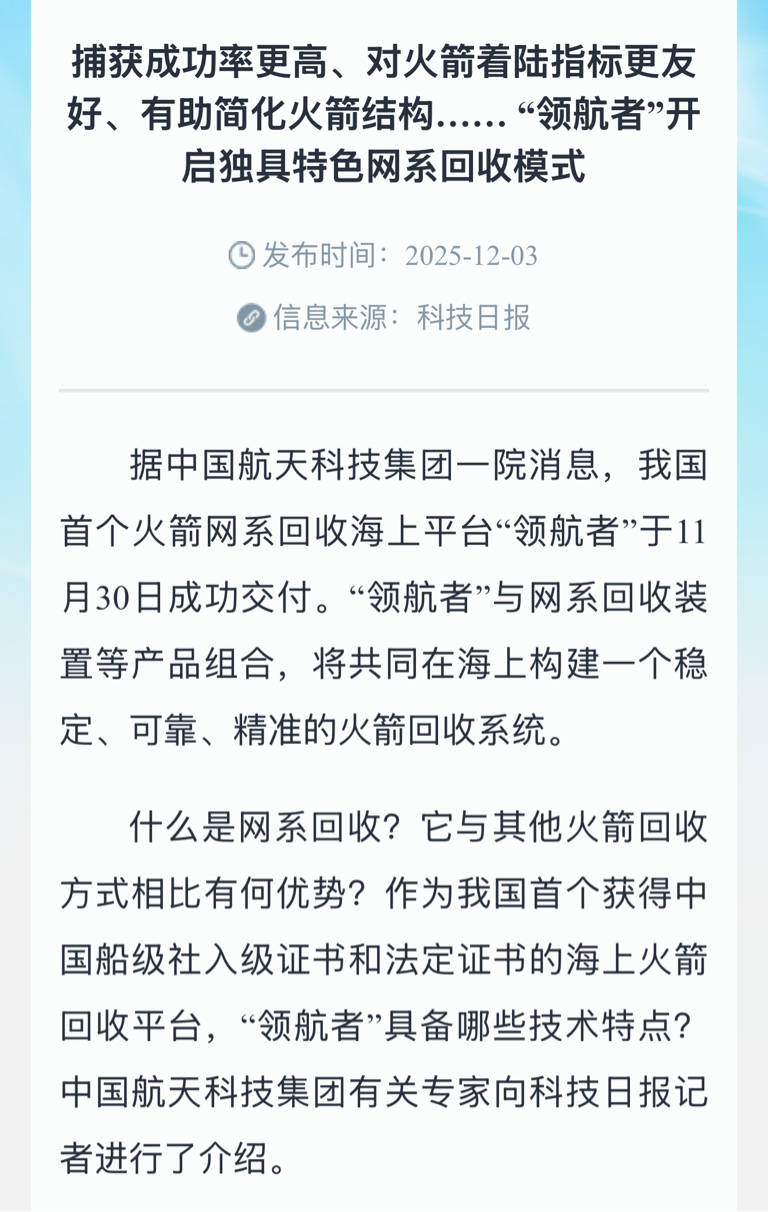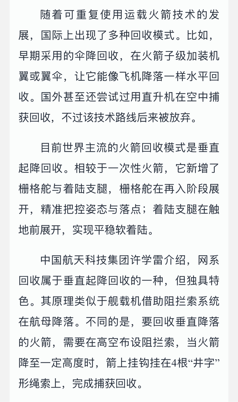 中国航天科技集团介绍,网系回收属于垂直起降回收的一种,但独具特色。其原理类似于舰