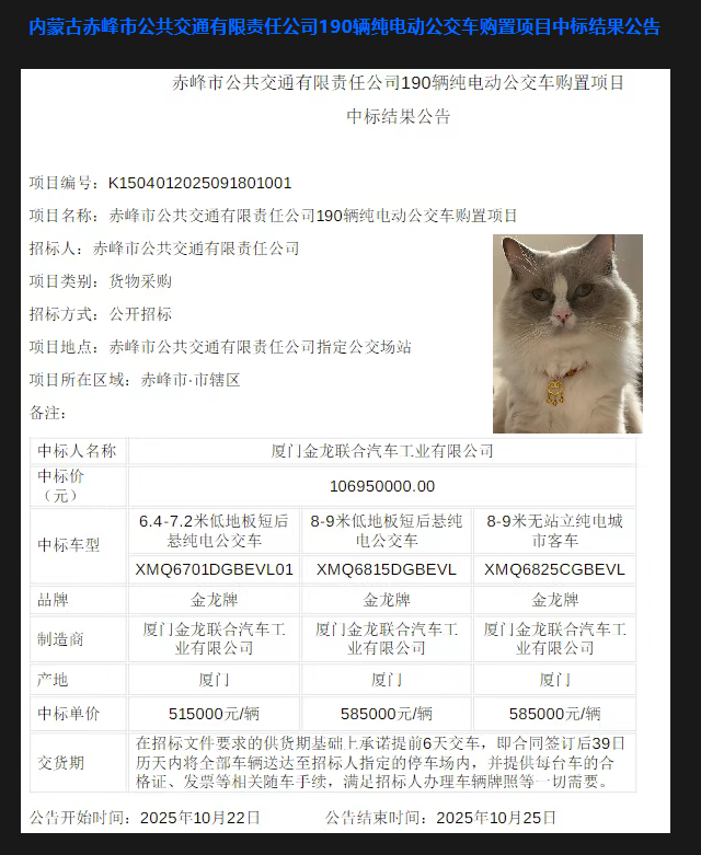 2025年10月22日,内蒙古赤峰市公共交通有限责任公司190辆纯电动公交车购置项目中标结果公告发布,此项目中标人为厦门金龙联合汽车工业有限公司,中标价格为106950000.00元。