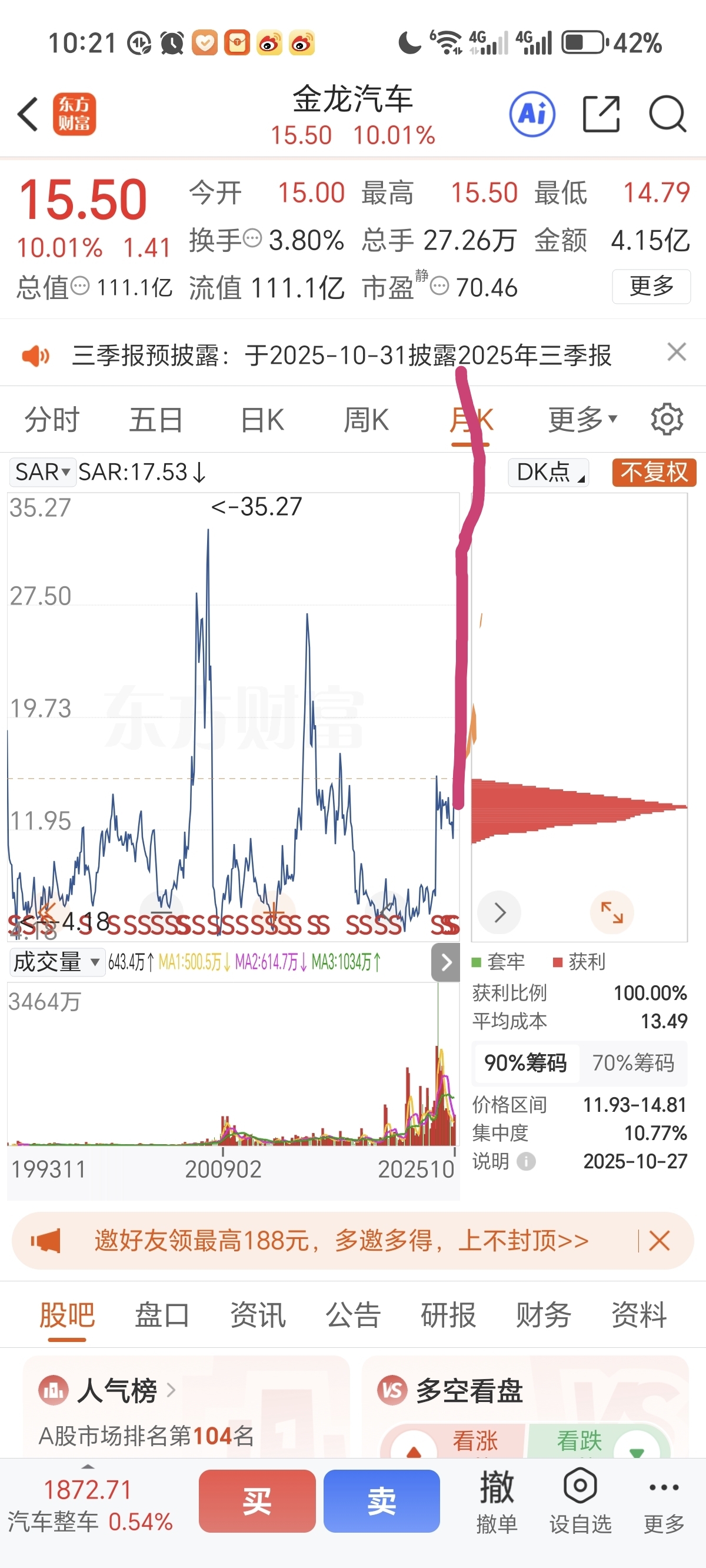$金龙汽车(SH600686)$ 扶摇直上九万里,月线真好看