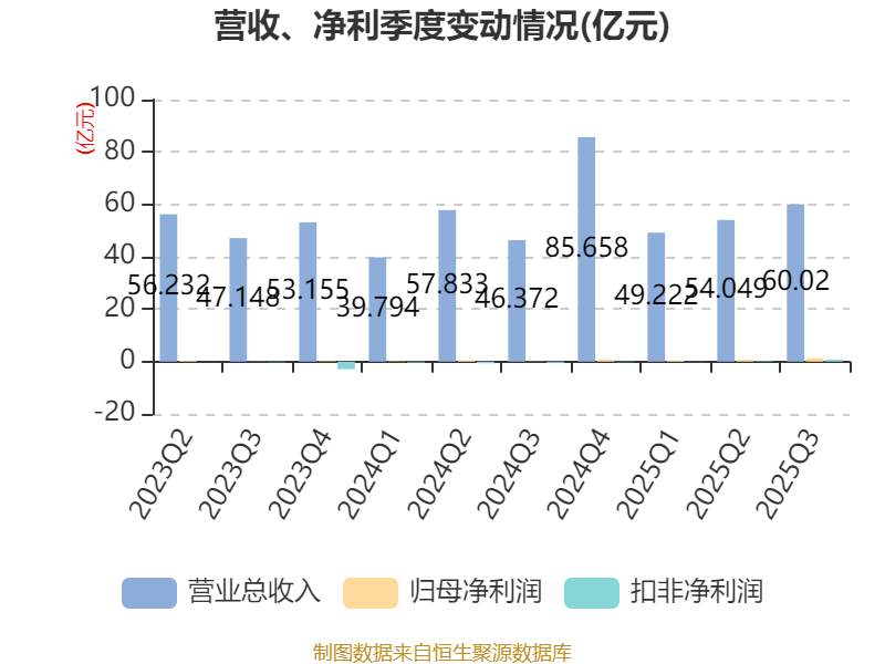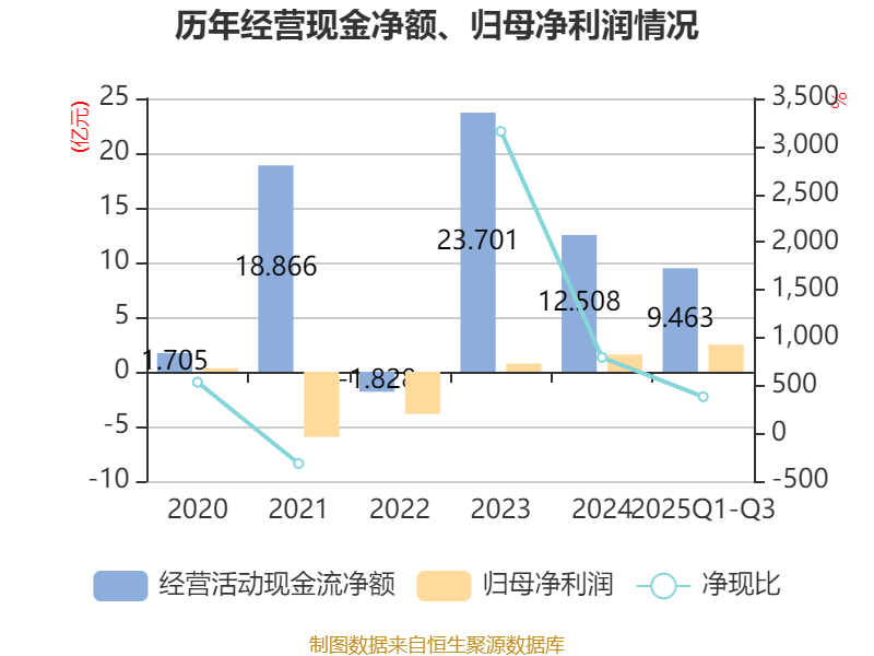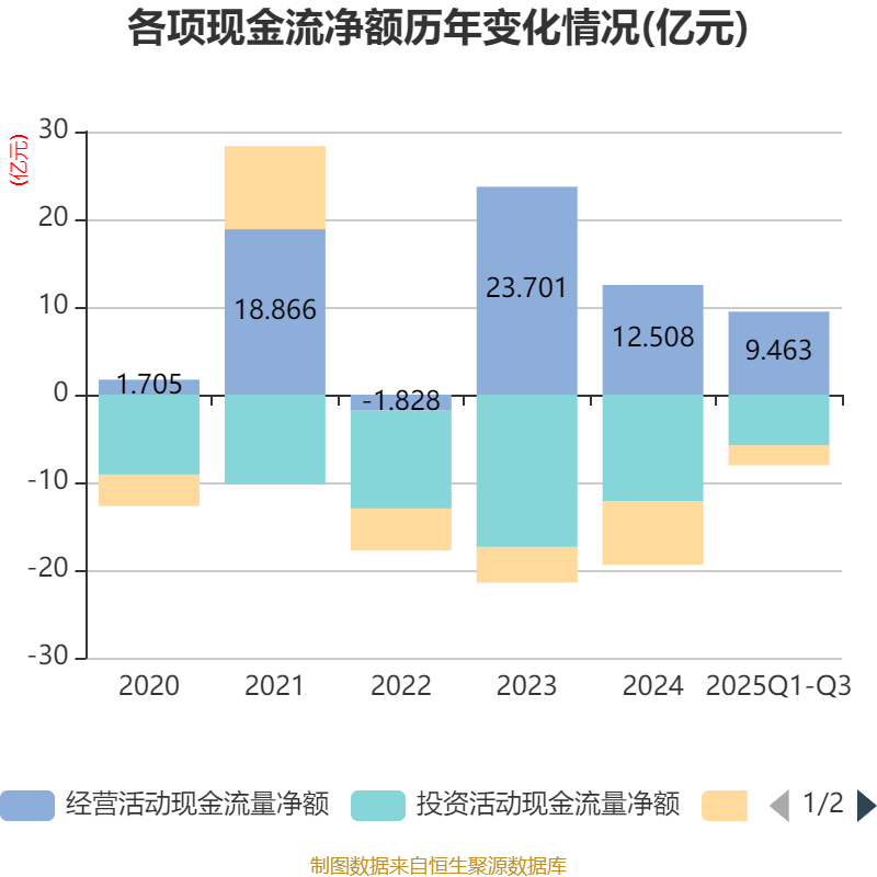 2025年前三季度,公司经营活动现金流净额为9.46亿元,同比下降27.31%;筹资活动现金流净额-2.26亿元,同比减少1.64亿元;投资活动现金流净额-5.8亿元,上年同期为-20.84亿元。