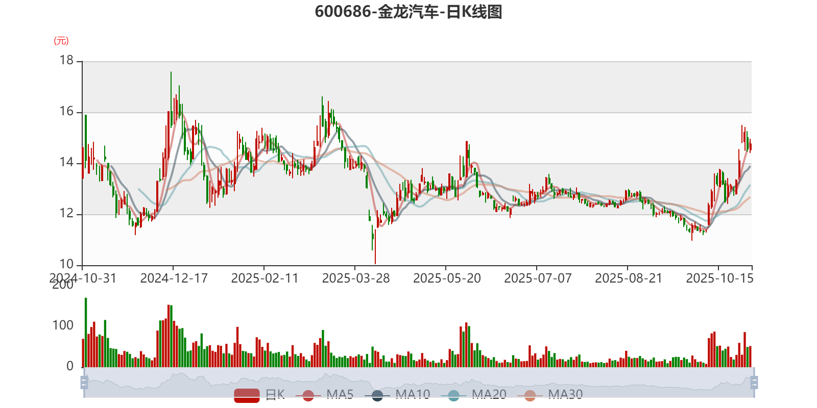 以10月30日收盘价计算,金龙汽车目前市盈率(TTM)约为32.18倍,市净率(LF)约3.24倍,市销率(TTM)约0.42倍。