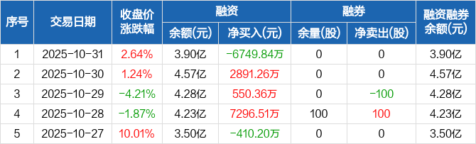 融资方面,当日融资买入9437.9万元,融资偿还1.62亿元,融资净偿还6749.84万元。融券方面,融券卖出0股,融券偿还0股,融券余量0股,融券余额0元。融资融券余额合计3.9亿元。