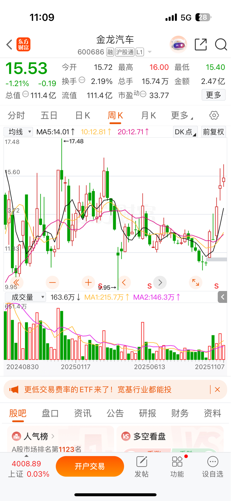 $金龙汽车(SH600686)$ 周线两个十字,可能要大涨了,