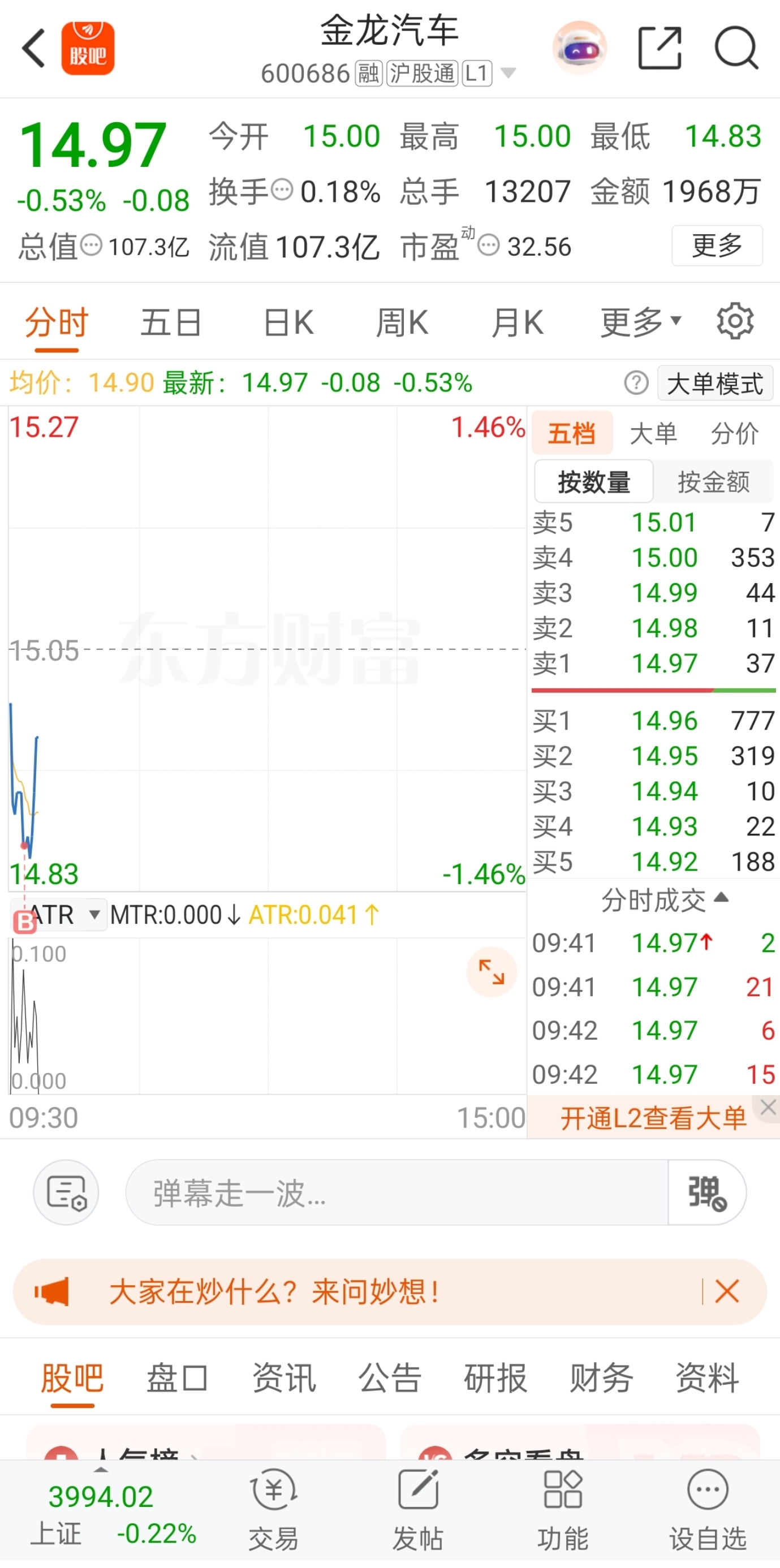 水下低吸介入了个股$金龙汽车(SH600686)$