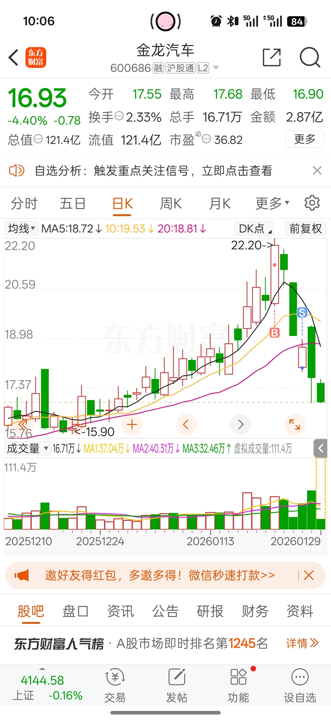 $金龙汽车(SH600686)$ 一买就使劲往下砸